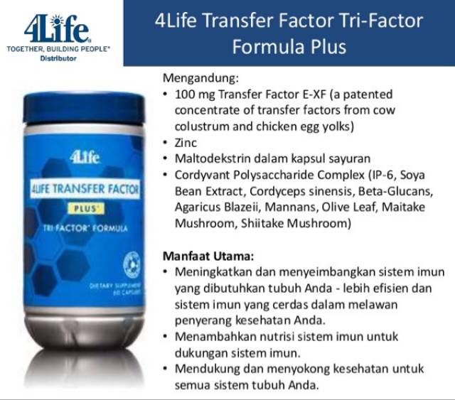Formula combines the power of Tri-Factor. 4Life Transfer Factor Plus Tri-Factor Formula. 4Life Transfer Factor proteins and other peptides support the immune systems ability to respond quickly and effectively.