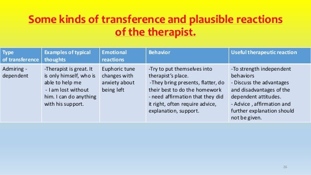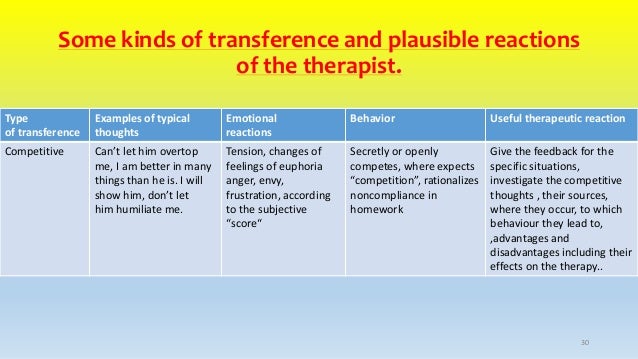 Let someone speak to. Especially the patients transfer to the therapist of feelings and attitudes associated with a parent or similar person from childhood. A great example of transference may be developing an unhealthy relationship with your therapist because their mannerisms remind you of your late father.