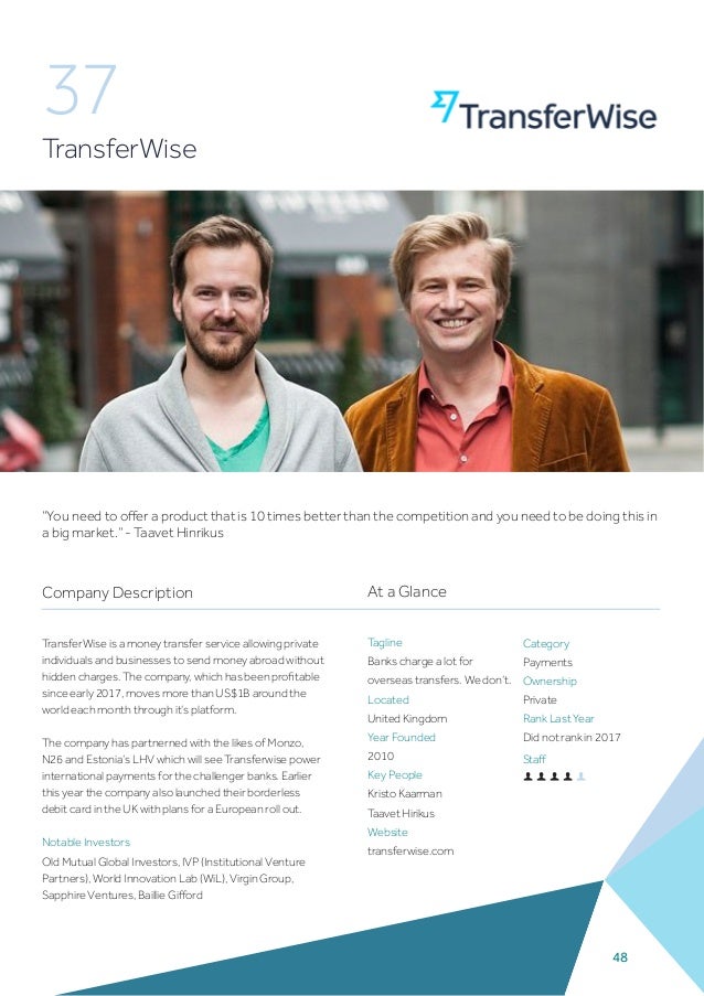 Contrastingly founded in 2010 18 of Transferwises engineers have been employed in the company for 3-5 years to date. 4152017 Taavet Hinrikus the founder and CEO of money transfer service TransferWise speaks to Adam Parsons about why London has become a hub for financial technology but explains why he wouldnt choose to headquarter his firm here if he was launching it today. And traditionally it has been.